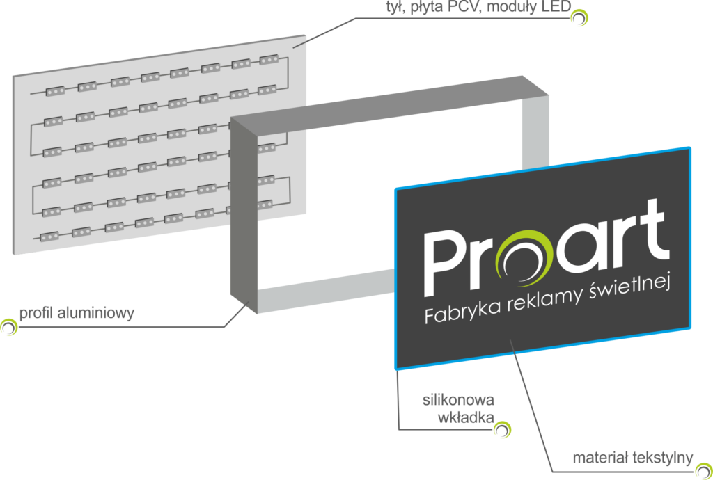 Podświetlane ścianki tekstylne tworzy specjalny profil aluminiowy, w którym umieszcona zostaje elastyczna i trwała tkanina przeznaczona do druku. Druk sublimacyjny zapewnia doskonałą głębię kolorów. Tkanina ta bardzo dobrze przepuszcza światło w jasnych miejscach,